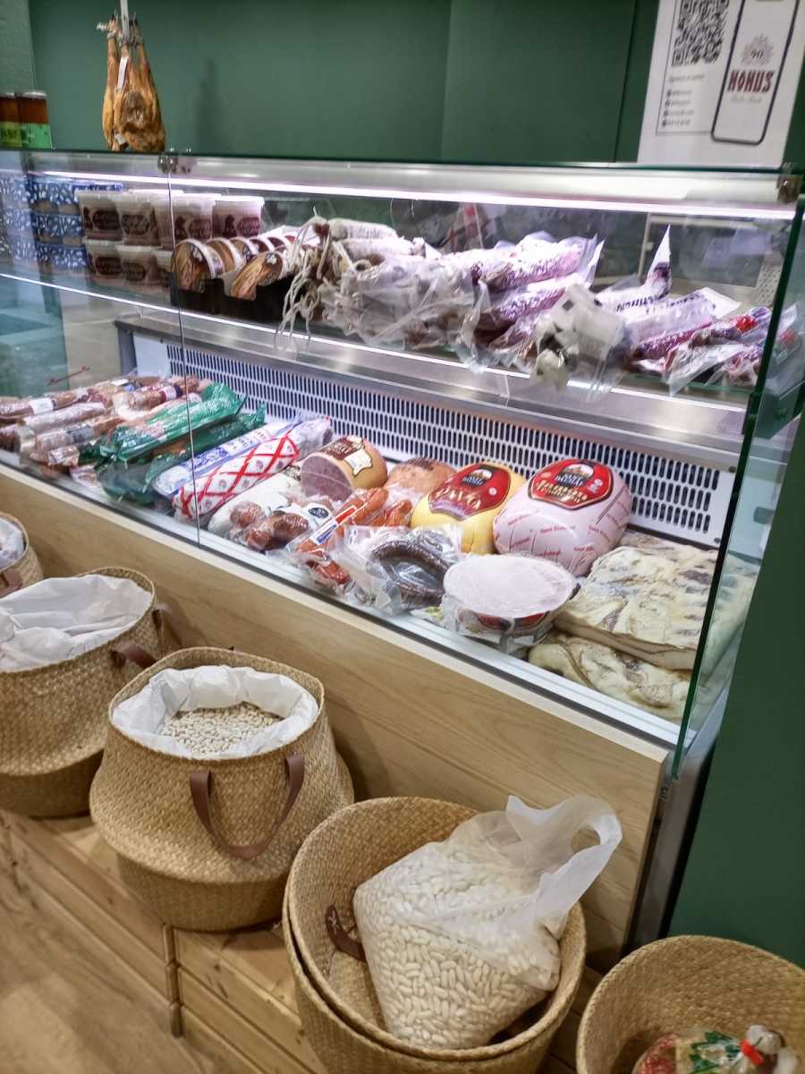 Tienda delicatessen con jamón al corte y un amplio surtido de productos gourmet.
